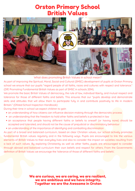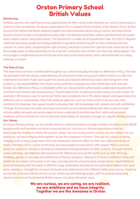 In accordance with The Department for Education we aim to actively promote British values in schools to ensure young people leave school prepared for life in modern Britain. Pupils are encouraged to regard people of all faiths, races and cultures with respect and understand that while different people may hold different views about what is ‘right’ and ‘wrong’, all people living in England are subject to its law.